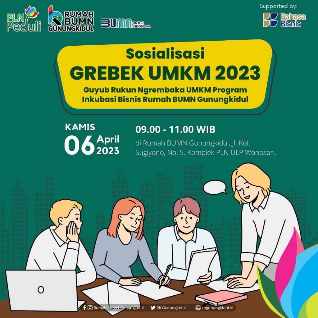 Bahasabisnis.id sebagai pengelola Rumah BUMN Gunungkidul kembali menyelenggarakan GREBEK UMKM (Guyub Rukun Ngrembaka UMKM) di tahun 2023 ini. GREBEK UMKM merupakan program inkubasi bisnis bagi pelaku UMKM dan start up di Kabupaten Gunungkidul. Program ini dilaksanakan untuk menciptakan wirausaha-wirausaha baru di Gunungkidul. Melalui program inkubasi ini, peserta diharapkan dapat meningkatkan kemampuan dan pengetahuan tentang membuat perencanaan usaha, mengelola usaha, literasi keuangan, penjualan, serta strategi pemasaran.