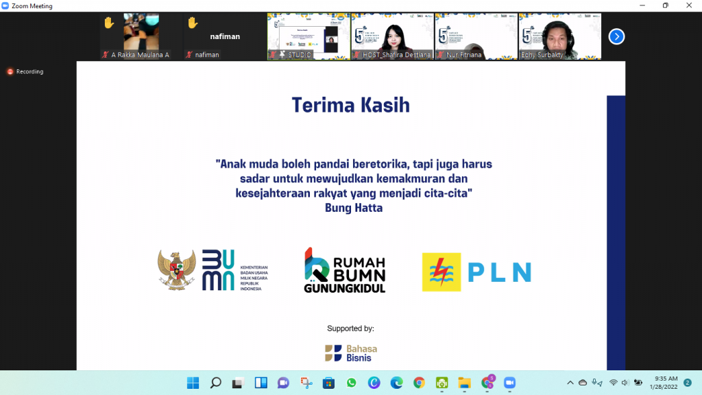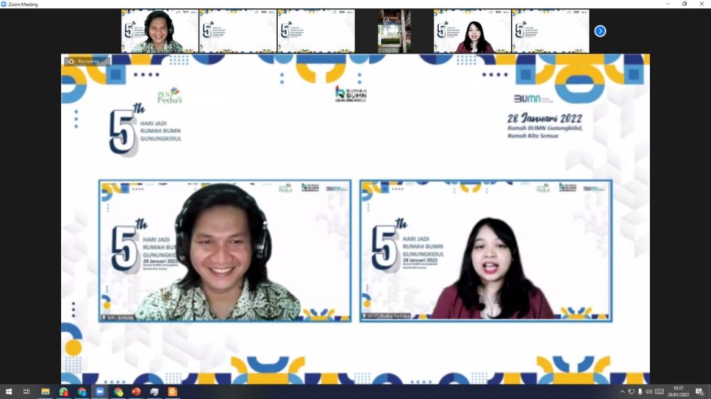 Bertepatan dengan Hari Ulang Tahun Rumah BUMN Gunungkidul yang ke 5 pada tanggal 28 Januari 2022, Rumah BUMN Gunungkidul bekerjasama dengan PLN mengadakan webinar berupa pemaparan materi “Peluang Bisnis 2022 Paling Menjanjikan di Gunungkidul”.